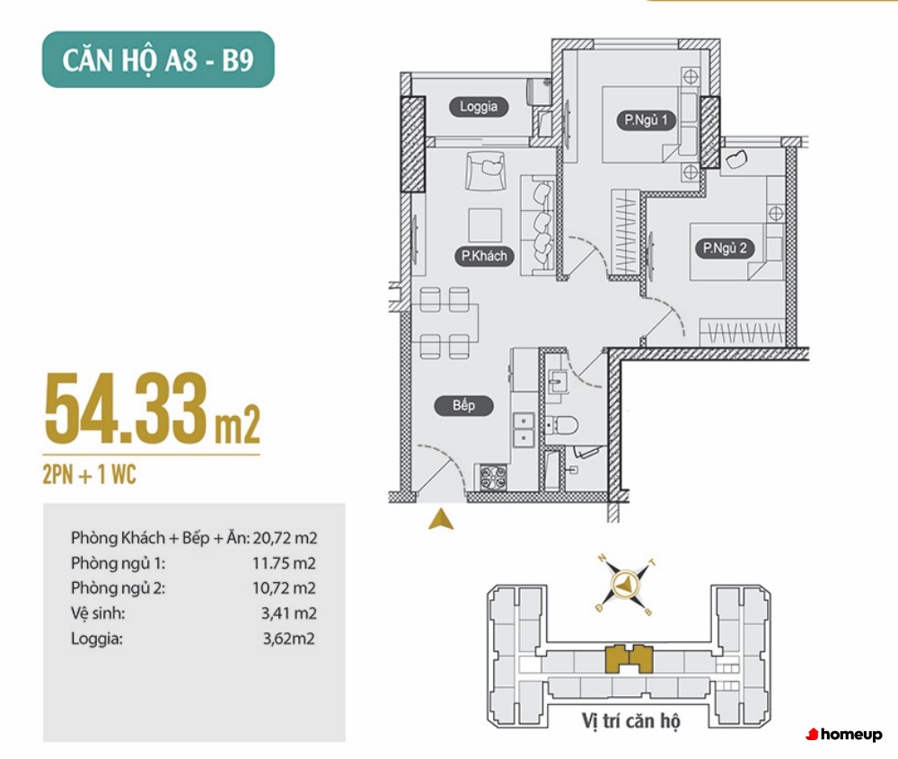Căn 2 phòng ngủ, 1 WC: diện tích từ 54,33m2 đến 55,88m2