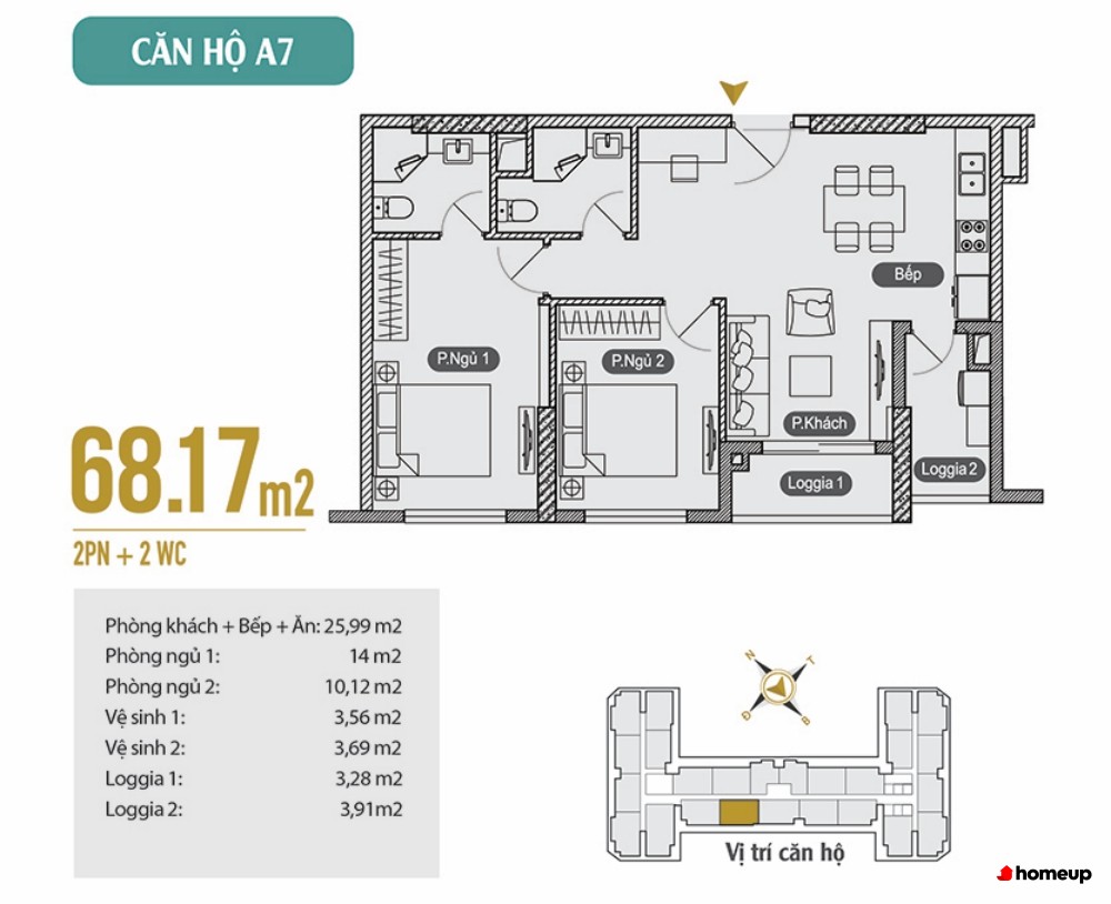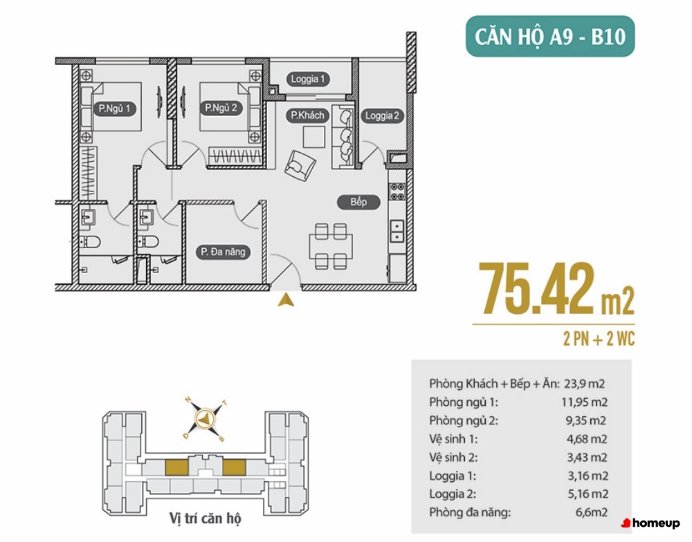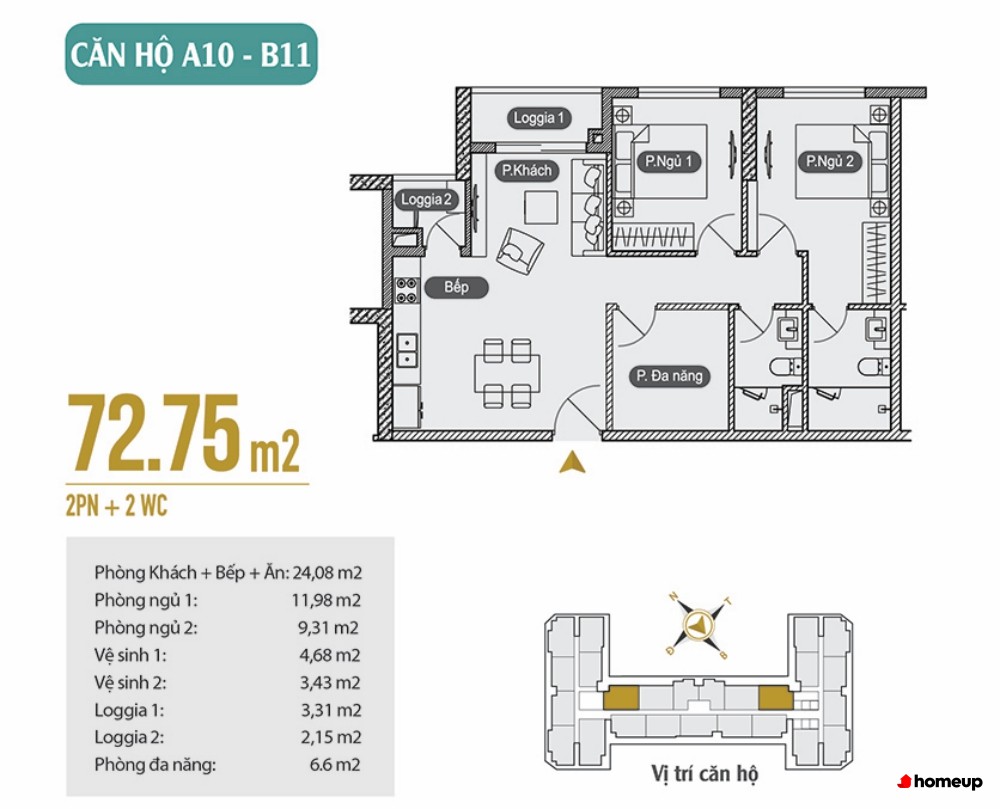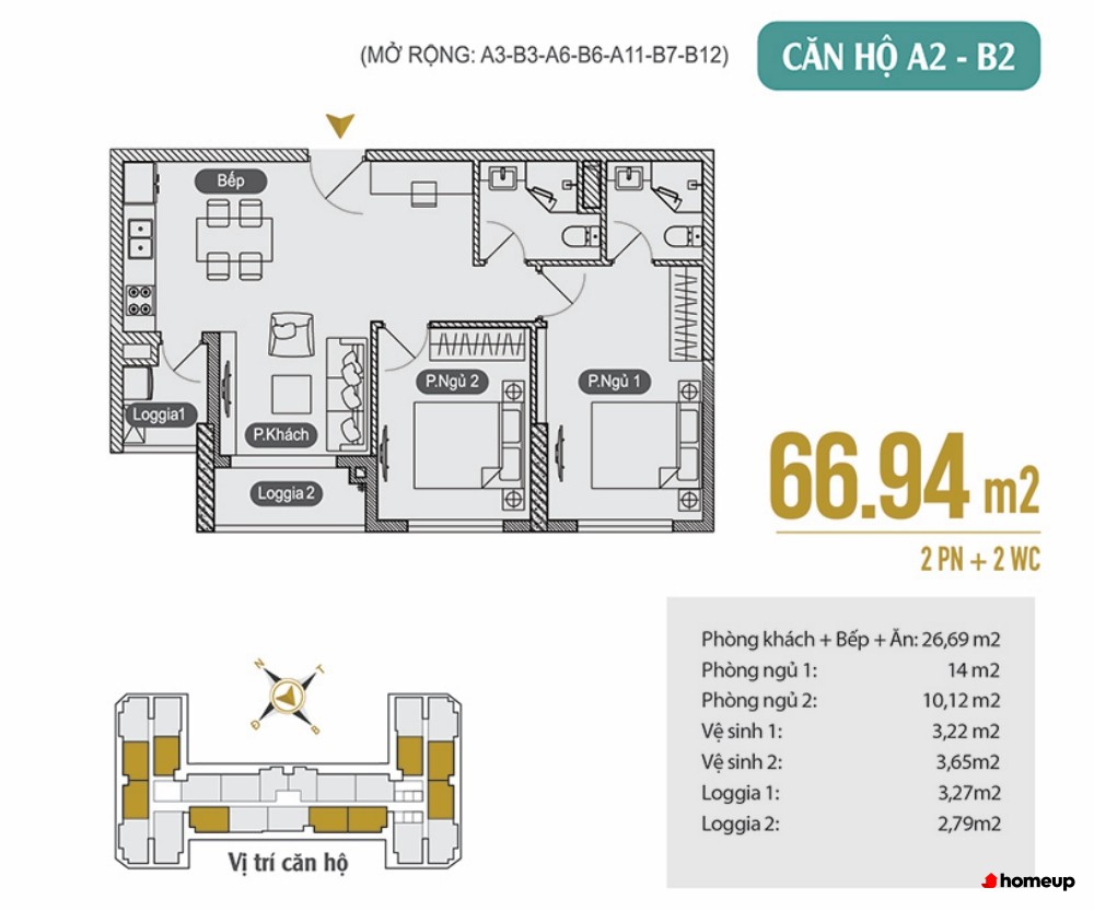 Căn 2 phòng ngủ, 2 WC: từ 66m22 đến 75m2