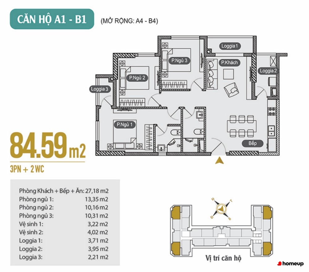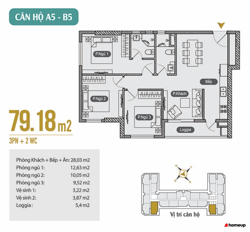 Căn 3 phòng, 2 WC: từ 79,18m2 đến 84,75m2