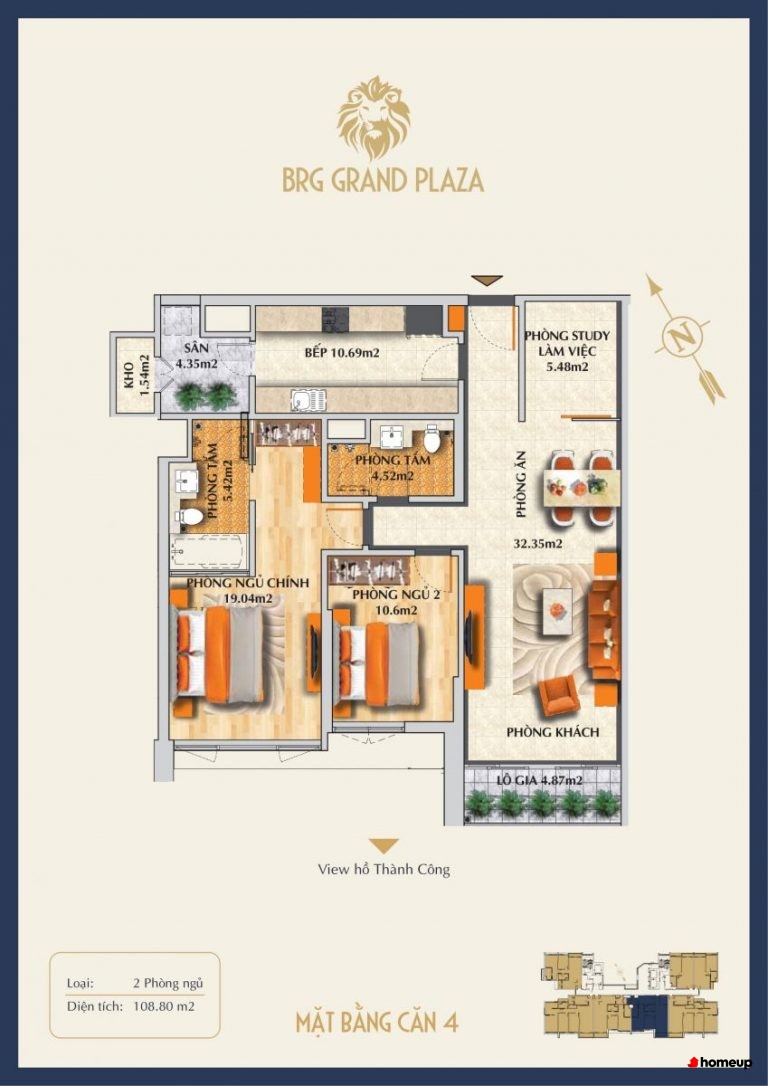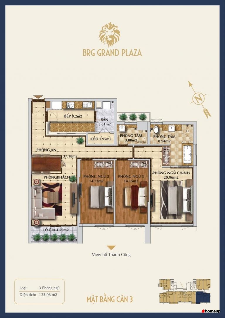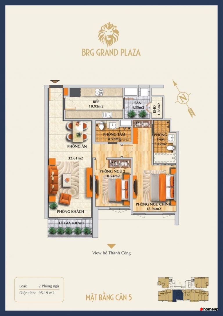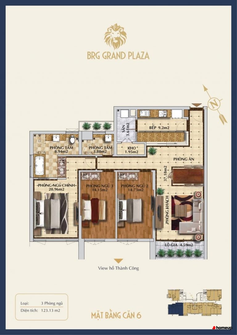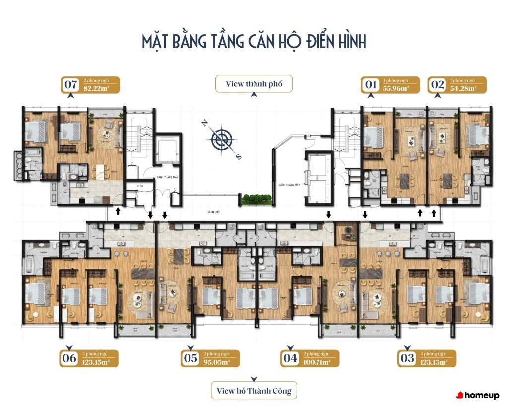 Dự án gồm 2 tòa tháp cao tầng, trong đó có 1 tòa văn phòng cho thuê và 1 tòa khu căn hộ để ở Khu căn hộ gồm tổng cộng 128 căn hộ cao cấp, được thiết kế đa dạng. Cụ thể, diện tích căn hộ rộng từ 54,28m2 - 123,15m2, bao gồm các loại căn 1, 2 và 3 phòng ngủ. Cụ thể, có các loại phòng sau: 54-55m2 (cho căn 1PN), 82-100m2 (căn 2PN) và 123m2 (căn 3PN). đáp ứng nhu cầu của nhiều nhóm đối tượng khách hàng khác nhau. Đặc biệt, những căn penthouse sang trọng trên tầng cao mang đến không gian sống đẳng cấp, cùng tầm nhìn bao quát hồ Thành Công và công viên xanh mát xung quanh. Sự bố trí hợp lý giúp căn hộ luôn đón ánh sáng và gió tự nhiên, tạo không gian linh hoạt và phù hợp với nếp sống gia đình.