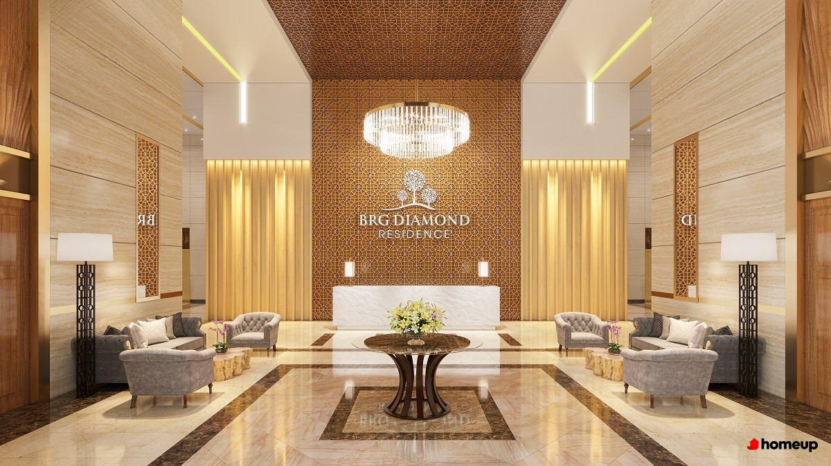 Trung tâm thương mại hiện đại tại chung cư BRG Diamond Residence Sảnh lễ tân 5 sao, rộng rãi có trần cao 9m lát đá marble nguyên khối, có quầy concierge như khách sạn hạng sang, thường chỉ xuất hiện ở dự án bất động sản hạng sang.