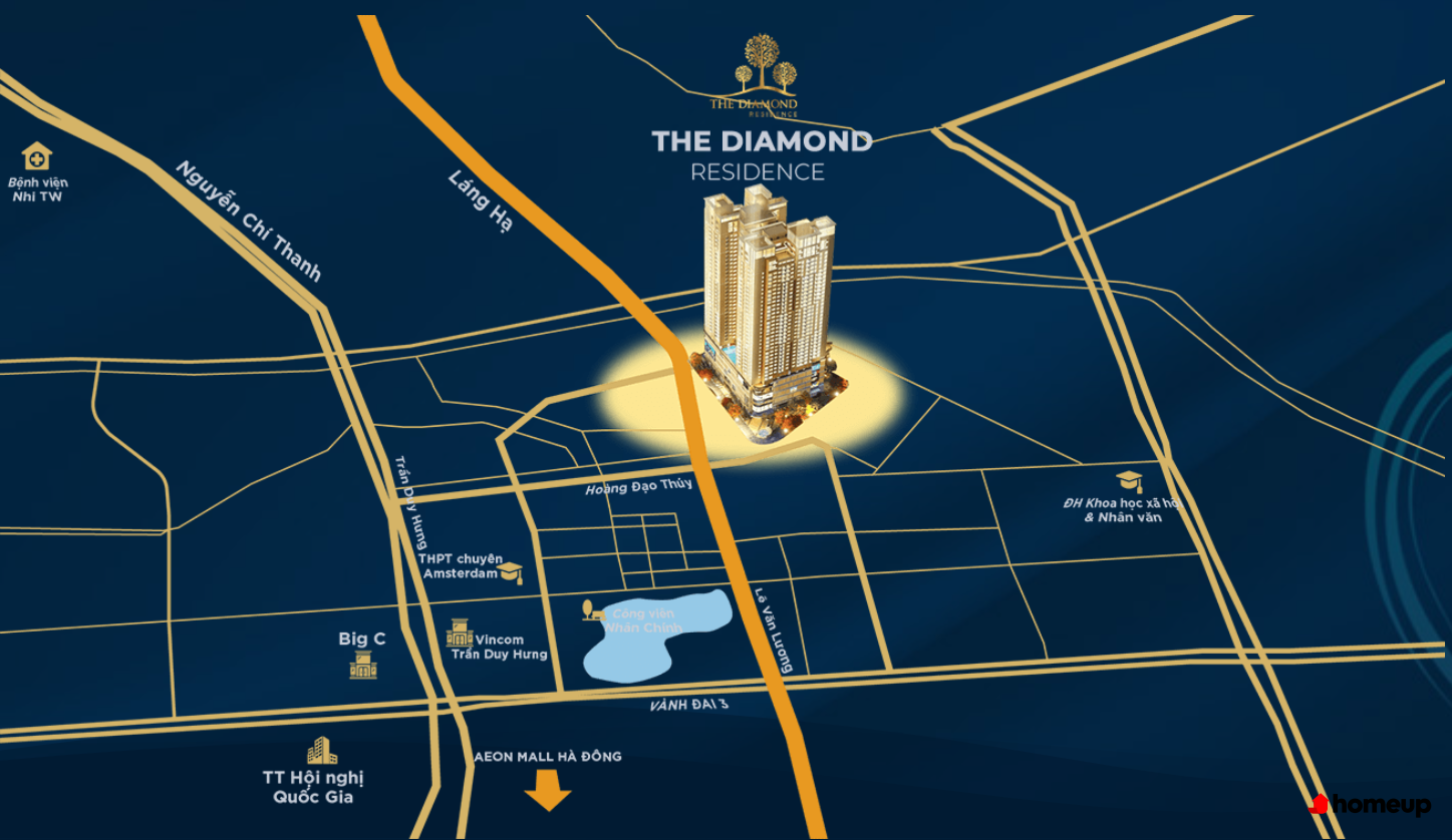Chung cư BRG Diamond Residence sở hữu vị trí "kim cương" sôi động nhất thủ đô, vị trí chiến lược kết nối liền với các trục đường lớn: Khuất Duy Tiến, Trần Duy Hưng, Nguyễn Trãi, Vành đai 3. Nhờ vậy mà cư dân dễ dàng di chuyển tới trung tâm quận Ba Đình, Cầu Giấy, Đống Đa hay khu vực Mỹ Đình, Hà Đông chỉ trong khoảng 10-15 phút, hạn chế được tình trạng ùn tắc nội đô.