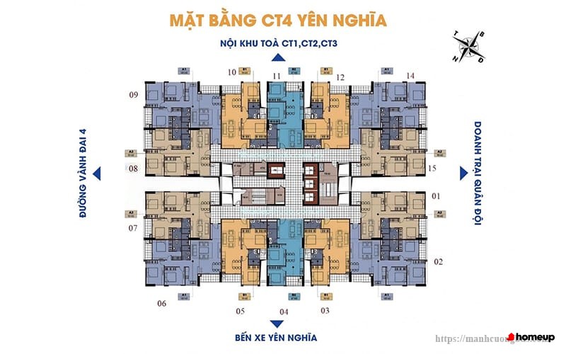 Mặt bằng tổng thể dự án CT4 Yên Nghĩa Các căn hộ tại CT4 Yên Nghĩa có diện tích đa dạng từ 67m2 đến hơn 100m2, phù hợp cho cả gia đình trẻ cũng như hộ gia đình nhiều thế hệ. Căn hộ được thiết kế thoáng sáng, tối ưu hóa diện tích sử dụng với 2-3 phòng ngủ, phòng khách rộng rãi kết nối bếp và logia tiện lợi. Điểm nhấn là không gian mở, đón ánh sáng và gió tự nhiên, mang lại cảm giác thoải mái cho gia chủ.