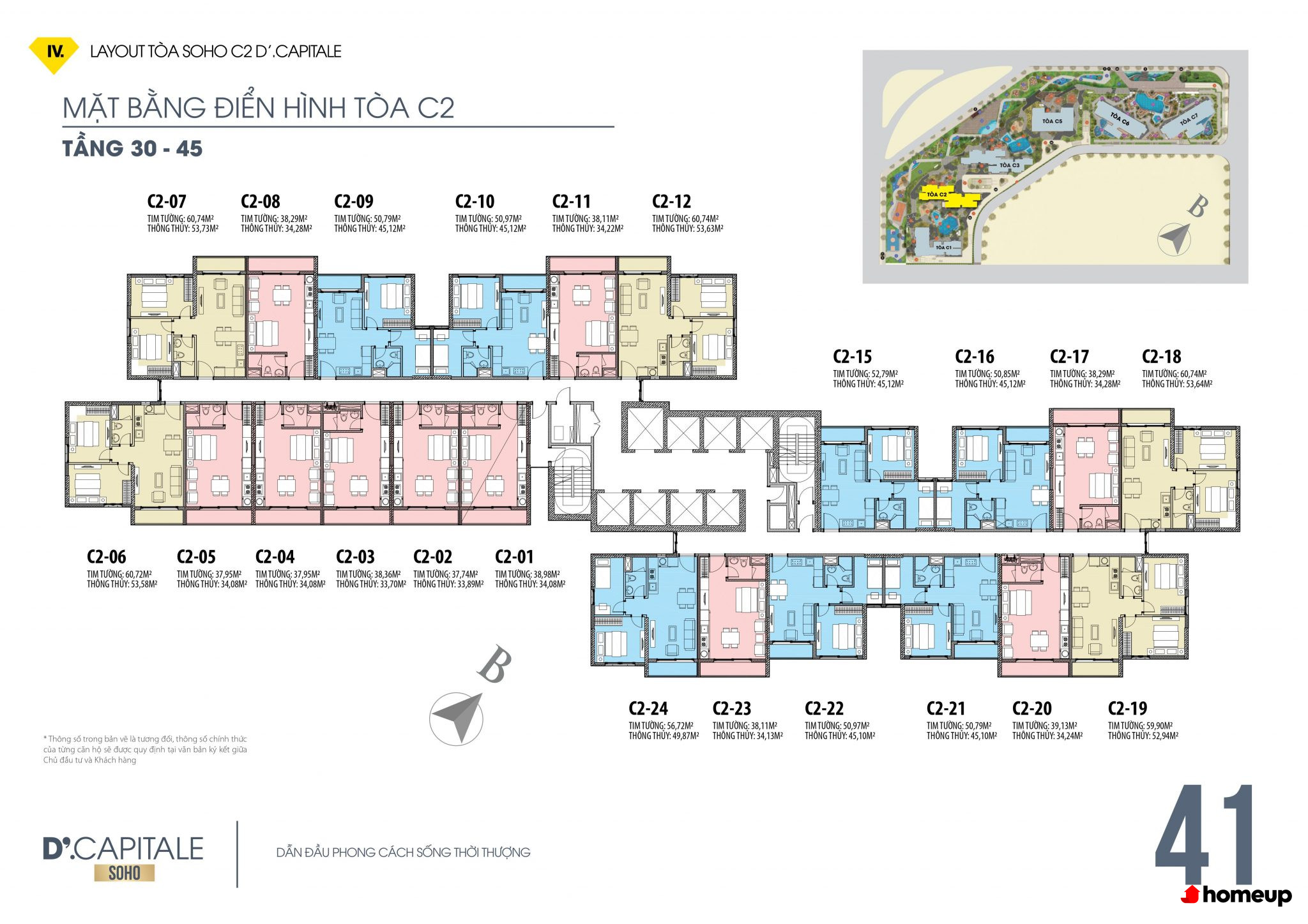 Dự án D’ Capitale gồm 6 tòa căn hộ cao từ 39 đến 46 tầng, chia thành 3 phân khu: Z1 (C1, C2), Z2 (C3, C6) và Z3 (C5, C7), mỗi tòa đều sở hữu sảnh riêng, lối đi riêng và hệ thống thang máy hiện đại. Mặt bằng căn hộ được thiết kế linh hoạt với đa dạng diện tích từ 38m2 - 120m2, bao gồm: căn hộ studio, 1PN, 2PN, 3PN, căn hộ thông tầng (penthouse), phù hợp với nhu cầu của nhiều nhóm khách hàng.