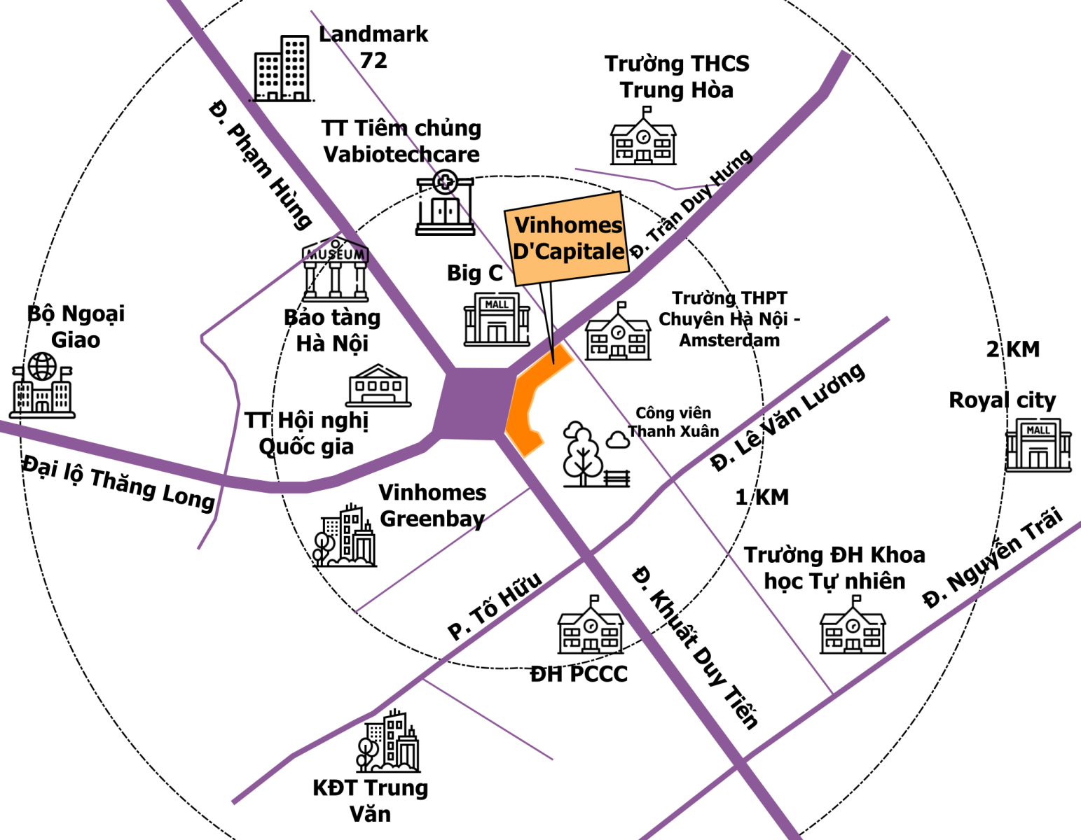Vị trí "kim cương" của chung cư D’ Capitale Vị trí lý tưởng của D' Capitale đặc biệt phù hợp với người đi làm, gia đình có con nhỏ và những ai mong muốn một cuộc sống hiện đại, thuận tiện. Dự án bao quanh bởi các khu đô thị lớn, trung tâm thương mại, trường học và hệ thống hạ tầng phát triển bậc nhất Hà Nội, mang đến giá trị sống và đầu tư bền vững.