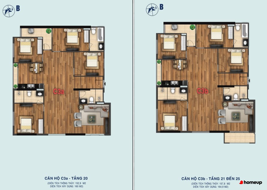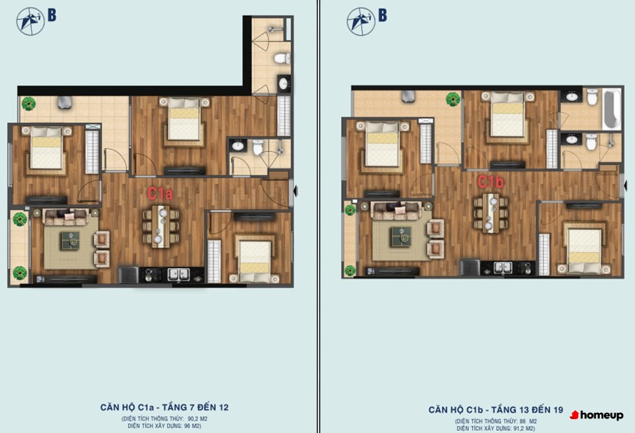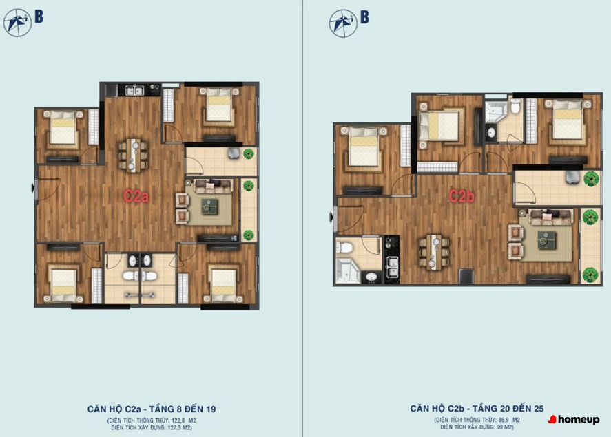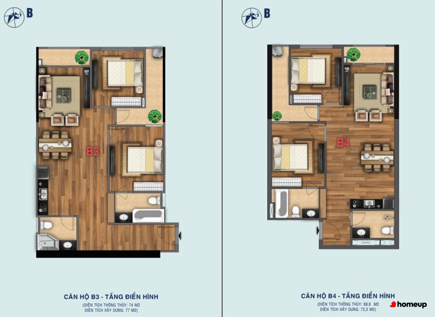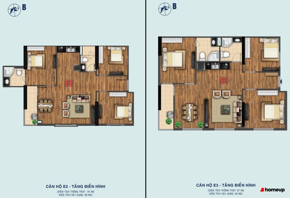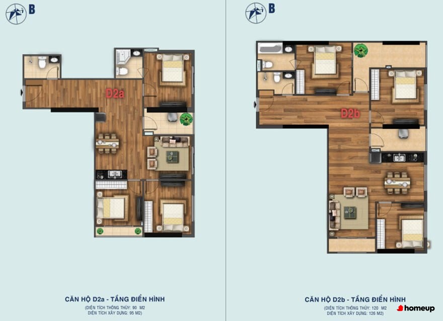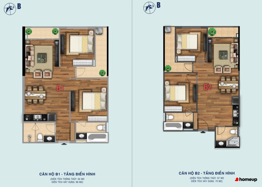 - Căn hộ thiết kế 2 phòng ngủ: 63.6 m2 – 64.3 m2