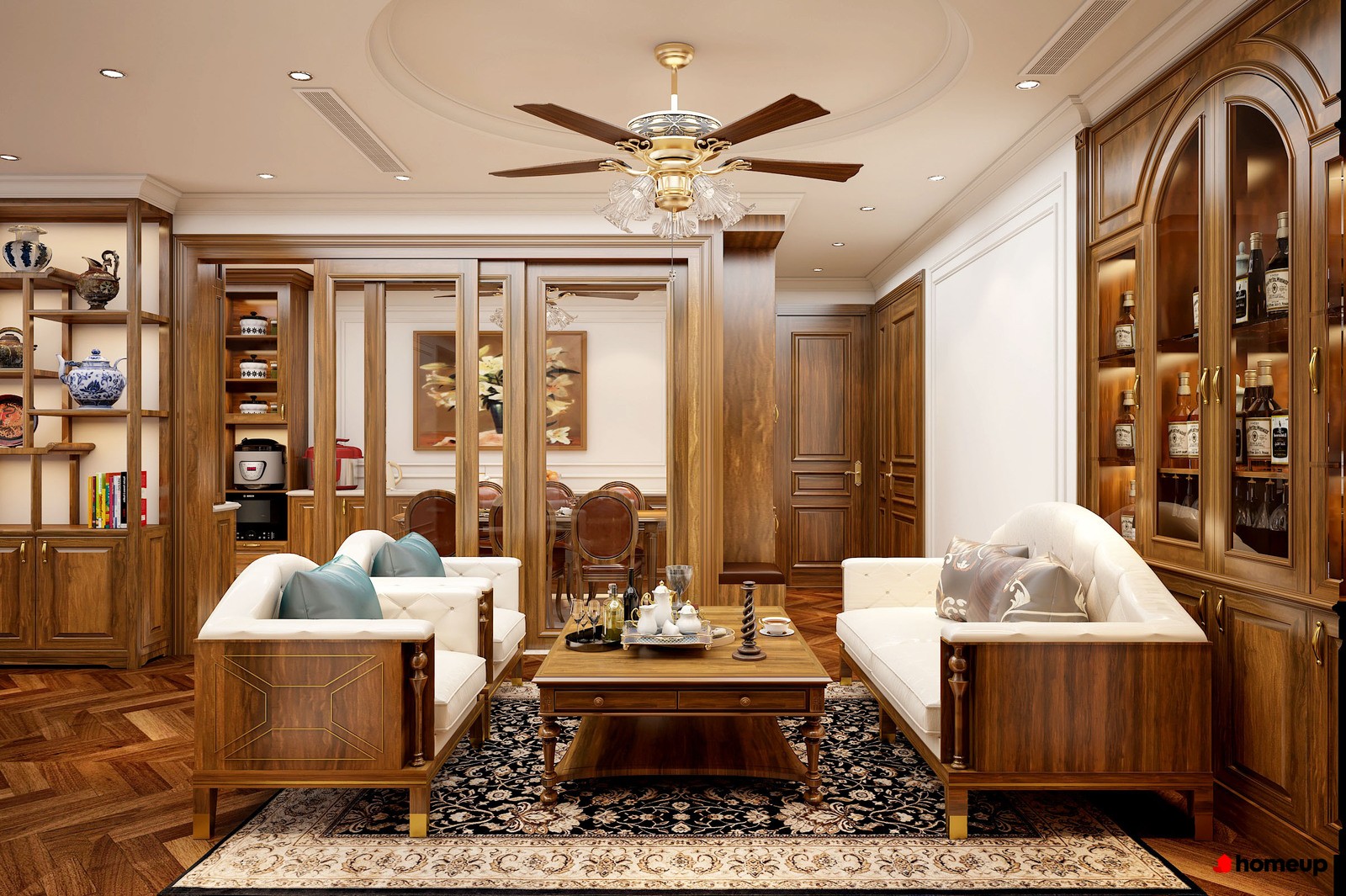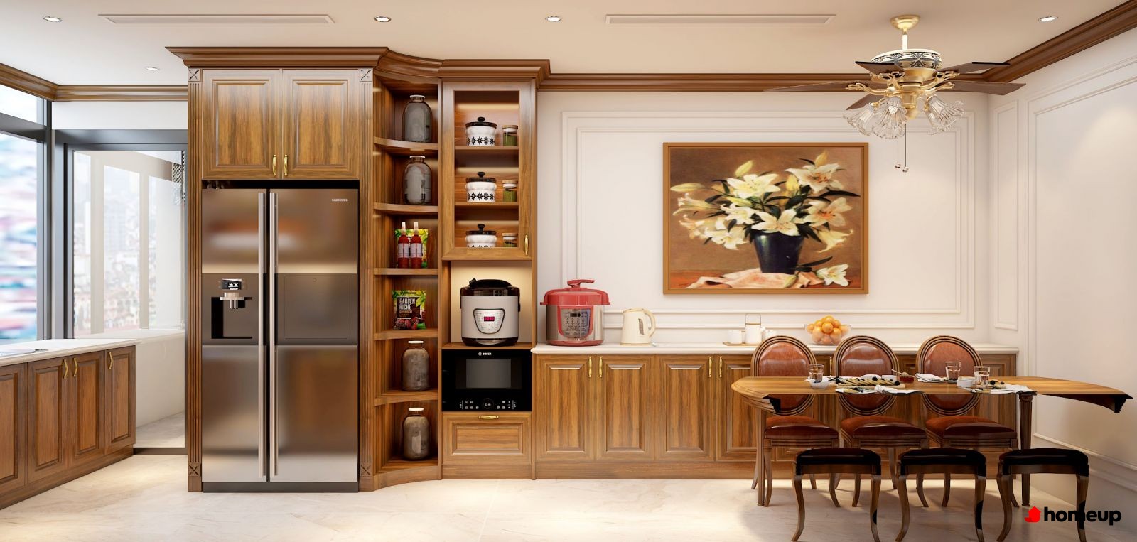 Khu bàn nước liên thông với phòng bếp, tạo cảm giác thông thoáng và gần gũi
