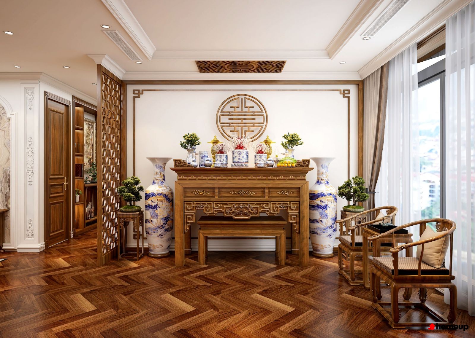 Khu bàn thờ bố trí phù hợp với niềm tin và nếp sống văn hóa của gia đình Việt