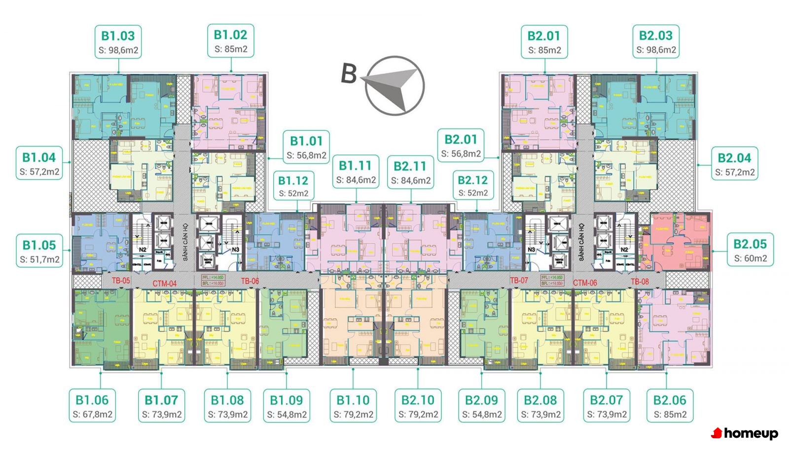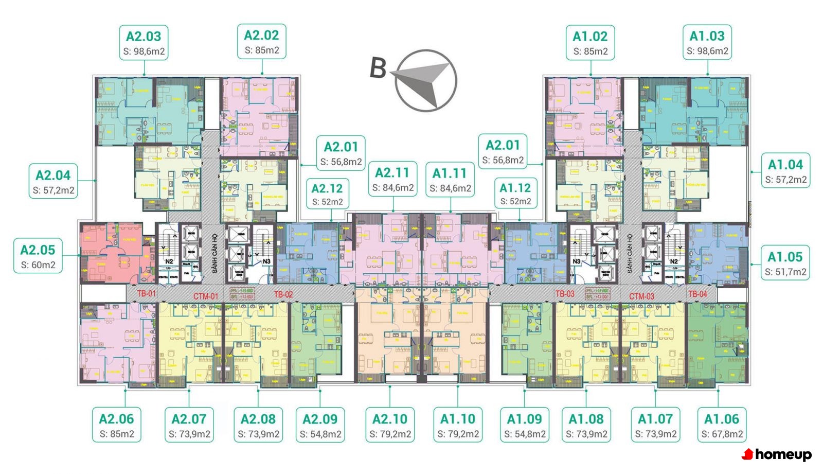Mặt bằng tòa dự án chung cư Phú Thịnh Green Park Chung cư cung cấp 532 căn hộ từ 2-3 phòng ngủ, diện tích linh hoạt từ 64-103 m2, đáp ứng nhu cầu đa dạng của gia đình trẻ, hộ gia đình đa thế hệ hoặc nhà đầu tư. Các căn hộ được thiết kế tối ưu ánh sáng tự nhiên và thông gió, giúp không gian sống luôn sáng sủa, thoáng đãng và tiết kiệm năng lượng.