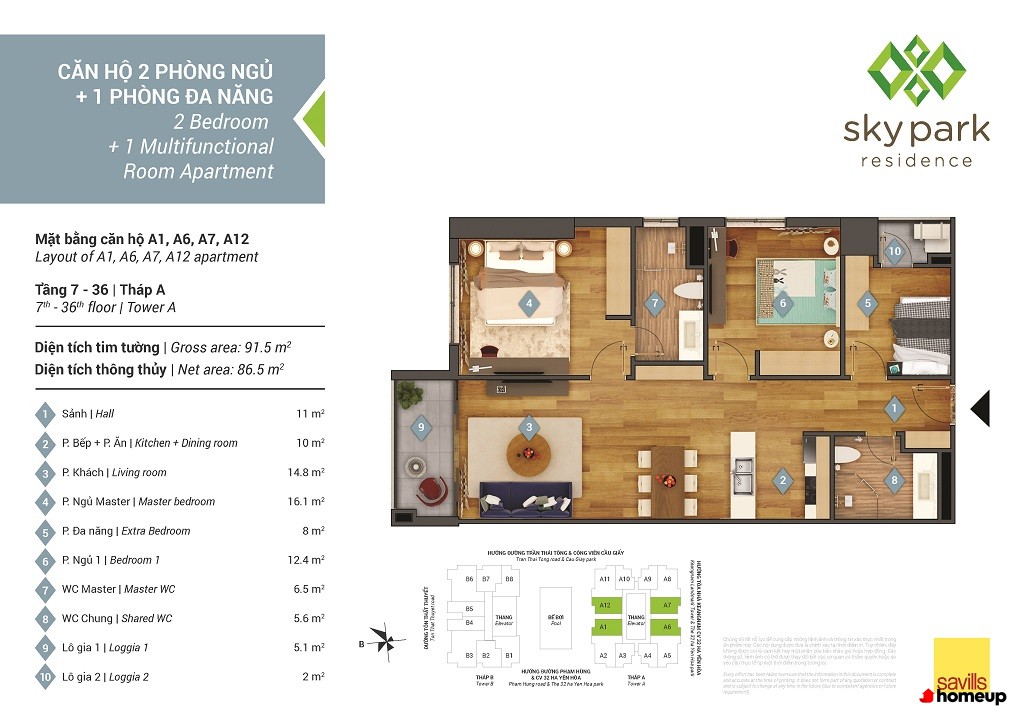 Tòa nhà nổi bật giữa công năng sử dụng và yếu tố thẩm mỹ xanh mát Các căn hộ tại Sky Park Residence có diện tích đa dạng từ 63 m2 đến hơn 330 m2, phù hợp với nhiều nhu cầu: từ gia đình trẻ đến hộ gia đình lớn. Cụ thể có các loại căn hộ:
