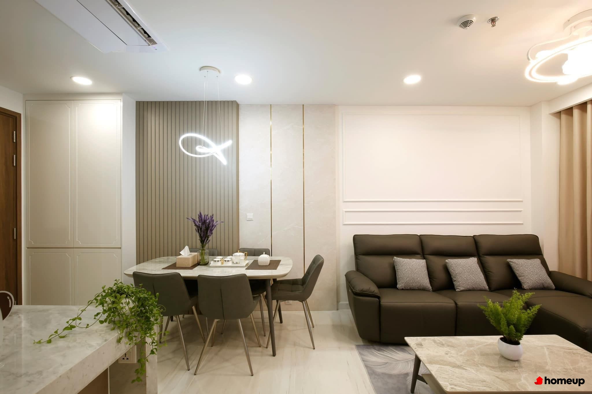 Thiết kế phòng khách - bếp liên thông, tạo không gian sinh hoạt chung gần gũi Loại căn hộ SME Hoàng Gia