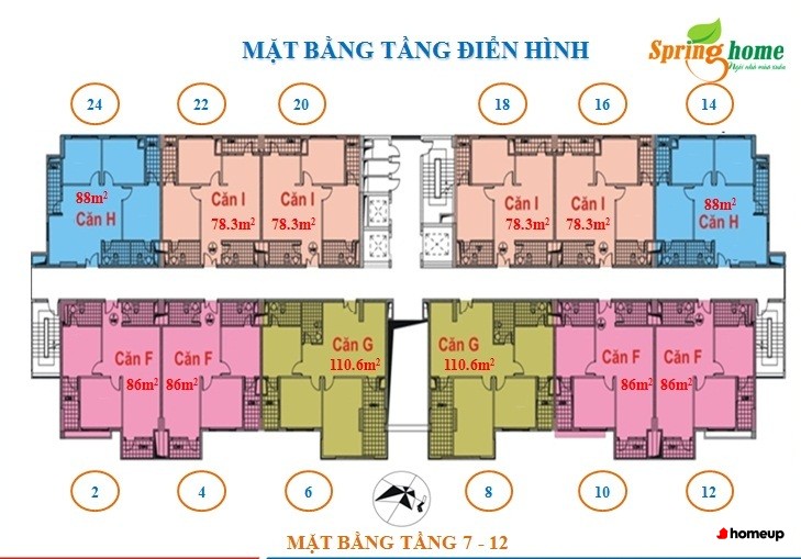 Thiết kế căn hộ hiện đại và sang trọng, mang đến cuộc sống thoải mái cho cư dân Các căn hộ tại Spring Home được bố trí hợp lý: từ tầng 3–6 mỗi tầng có 10 căn hộ, còn từ tầng 7–12 mỗi tầng có 12 căn hộ. Diện tích đa dạng từ 78m2 đến 148m2, gồm các loại hình 2–3 phòng ngủ, đáp ứng nhu cầu an cư của gia đình trẻ, hộ đa thế hệ cũng như nhà đầu tư. Không gian căn hộ được thiết kế thông minh, tối ưu hóa ánh sáng và gió tự nhiên, mang lại sự thoáng mát và gần gũi với thiên nhiên. Về nội thất bàn giao, căn hộ được trang bị đầy đủ hệ thống cửa, sàn gỗ, trần thạch cao và thiết bị chiếu sáng cơ bản. Khu bếp được lắp đặt tủ bếp, bồn rửa và hệ thống hút mùi hiện đại; phòng vệ sinh có sẵn thiết bị vệ sinh cao cấp và vách tắm kính.