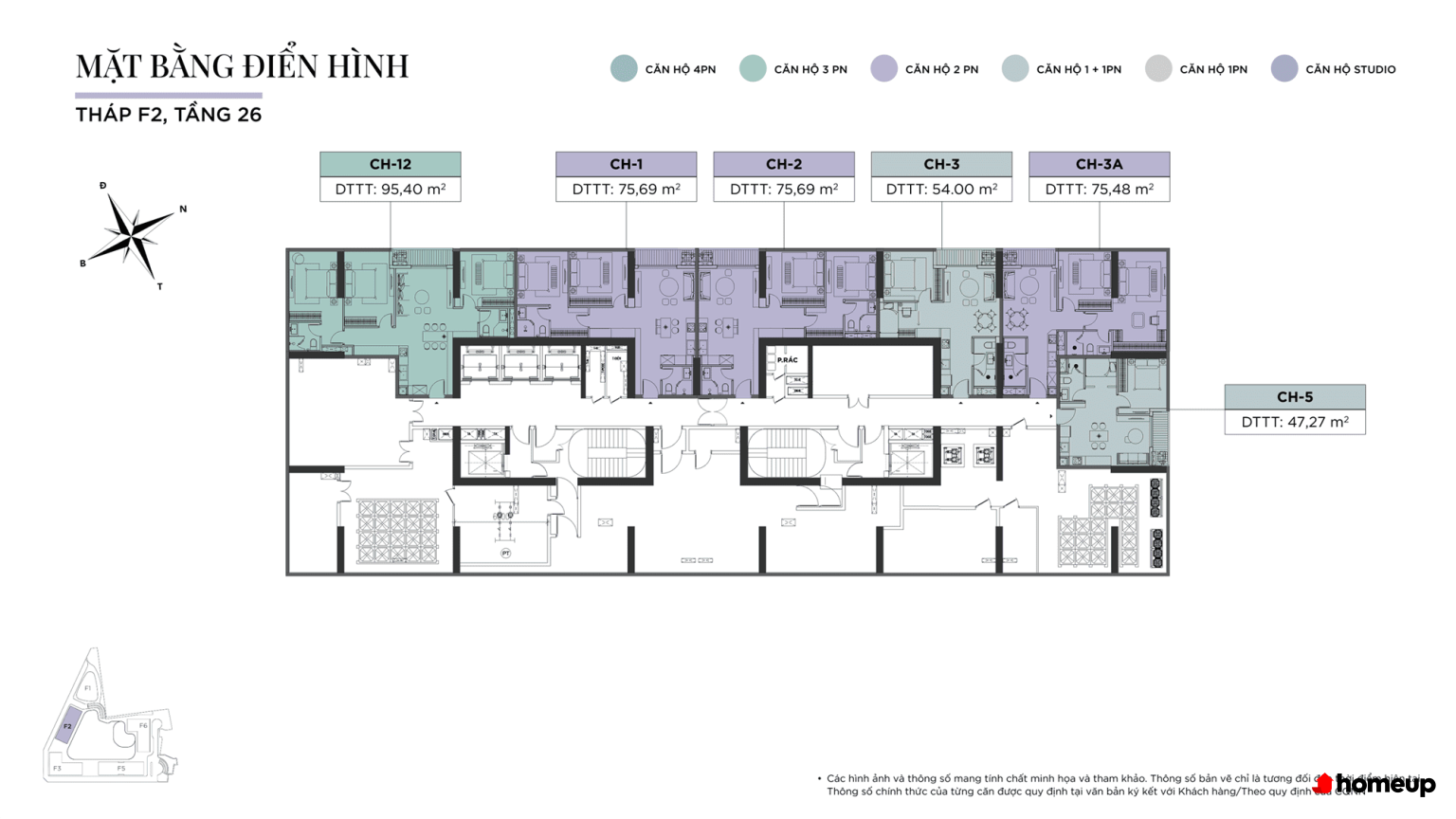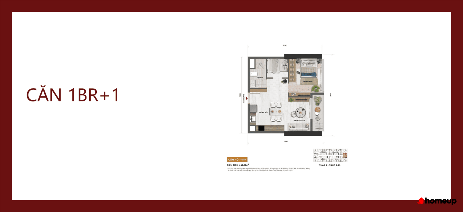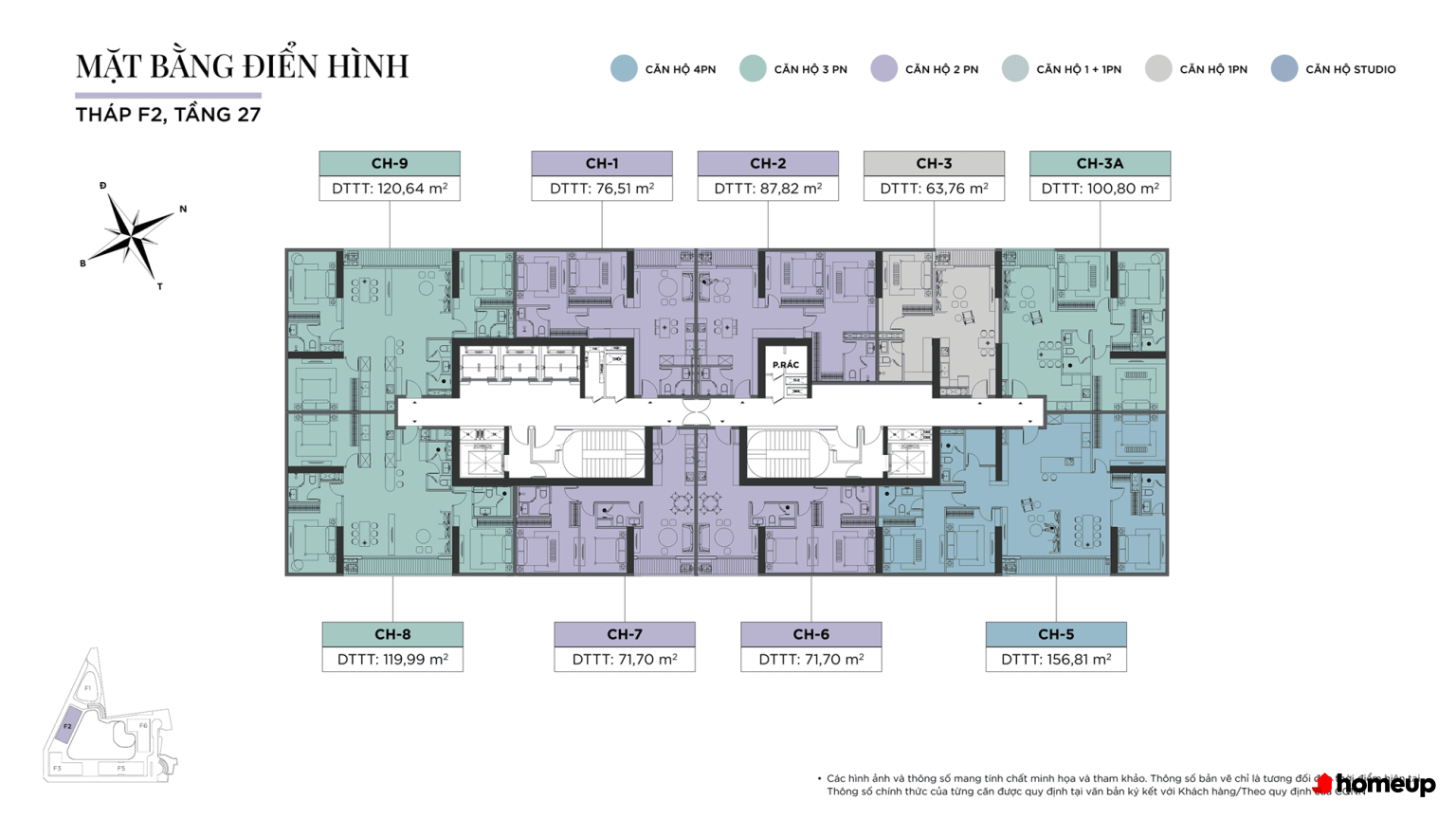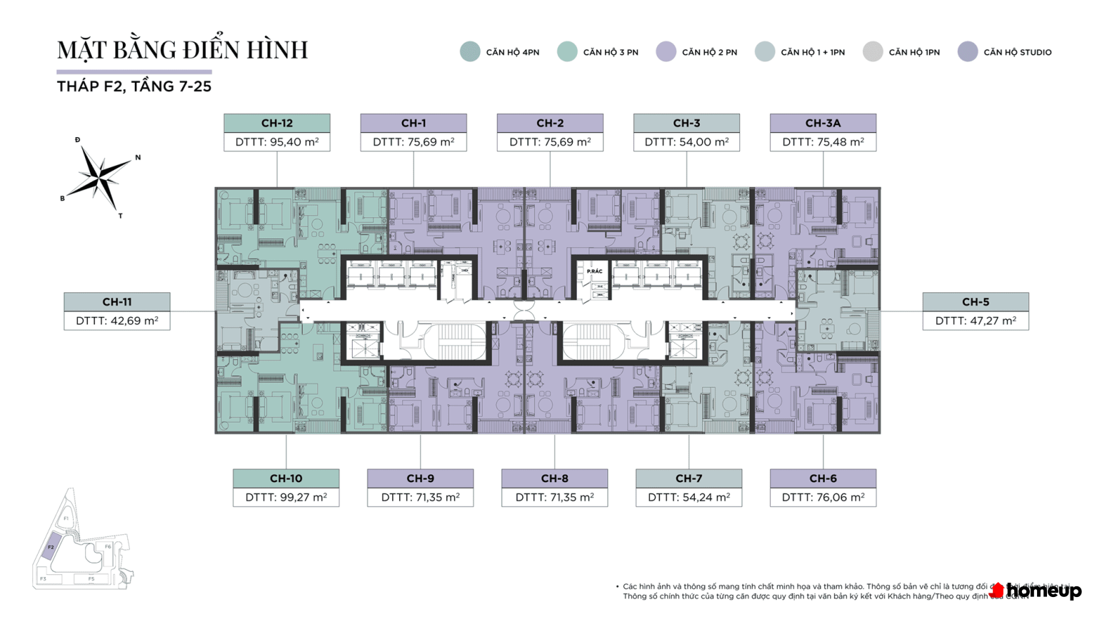 - Căn hộ 1PN+1: 55m2 - 61m2.