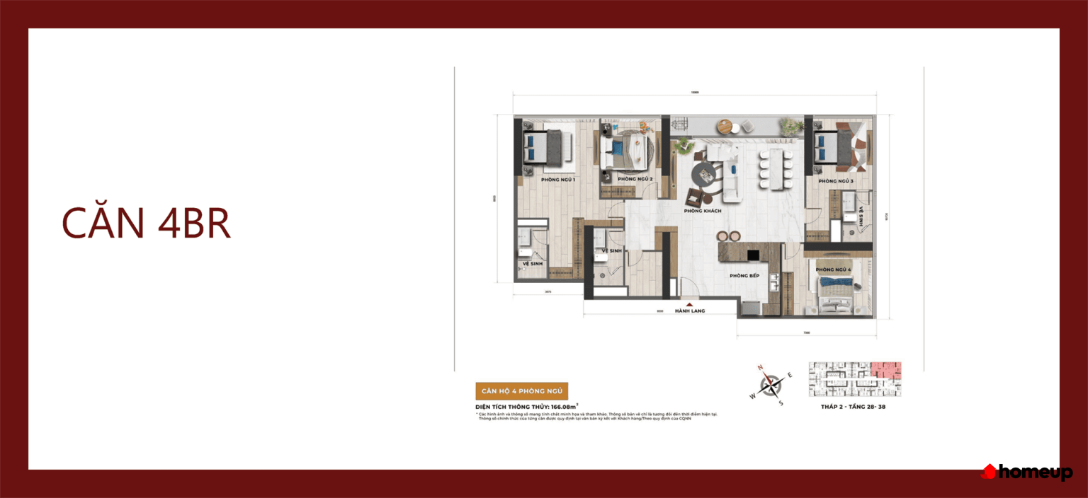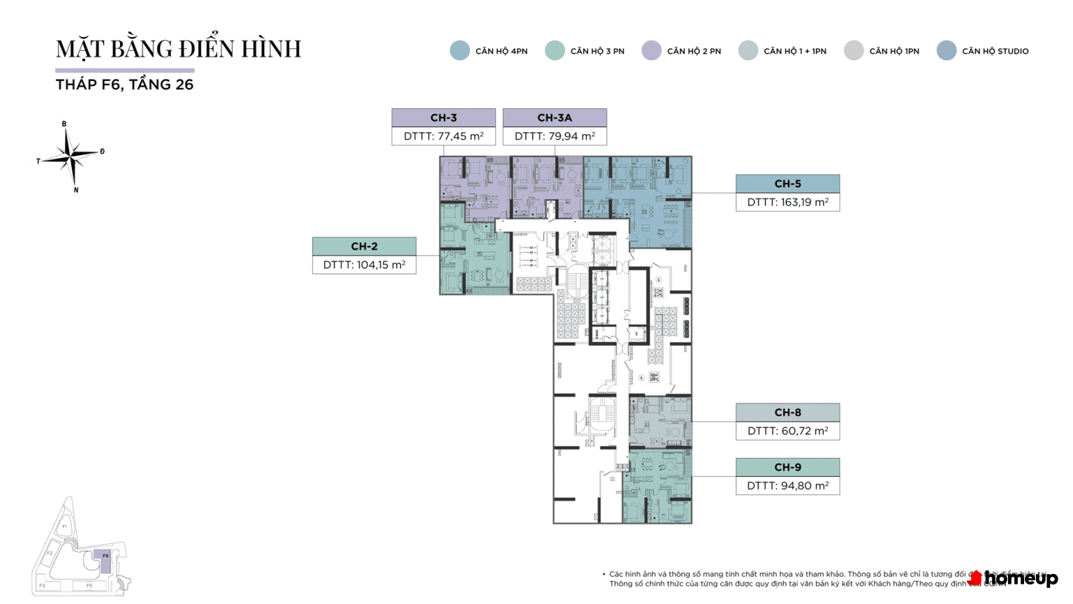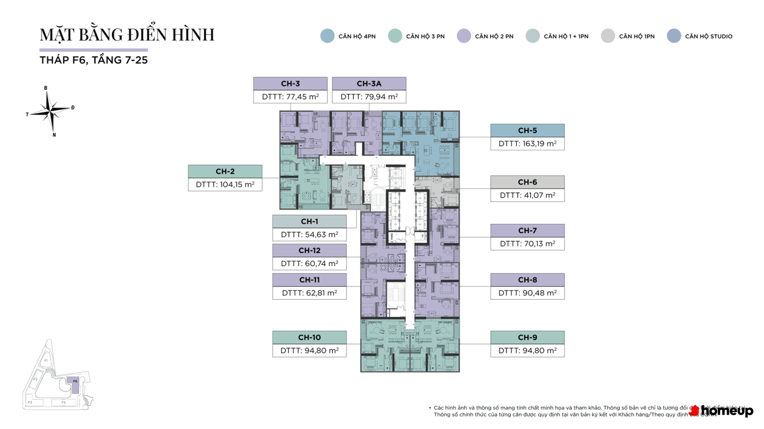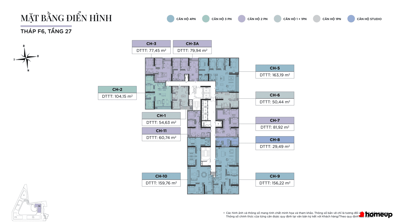 - Căn hộ 1PN+1: 55m2 - 61m2.