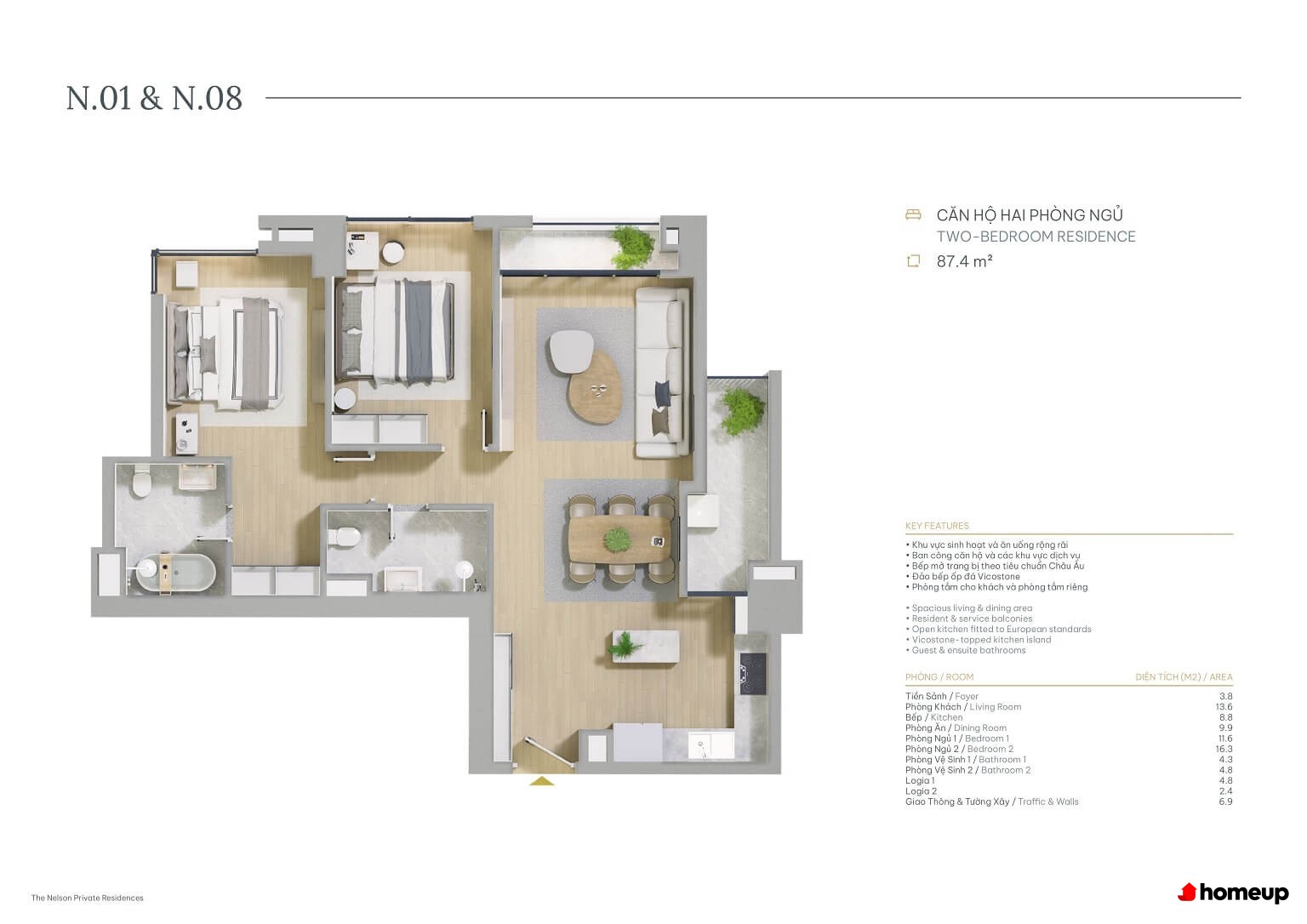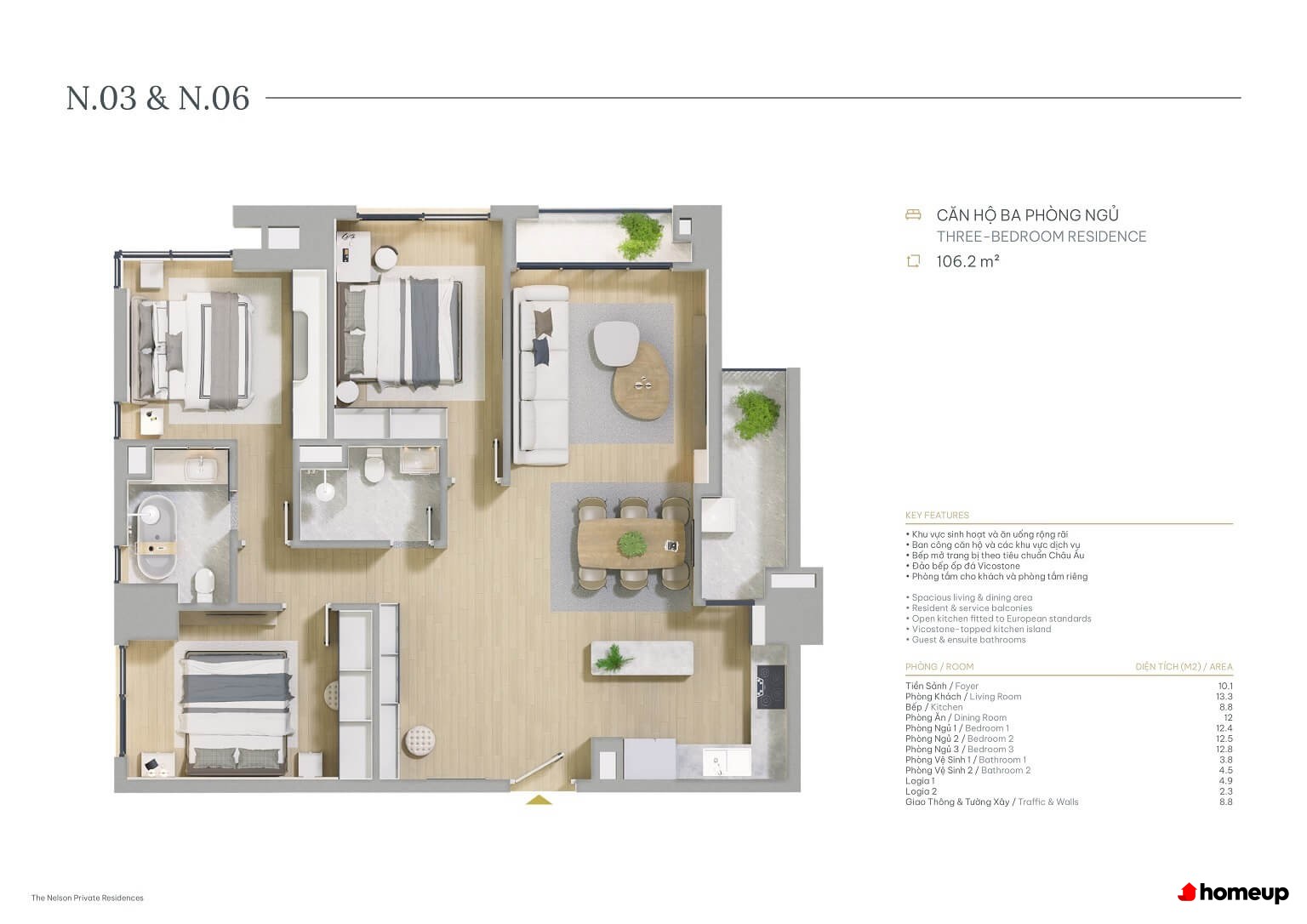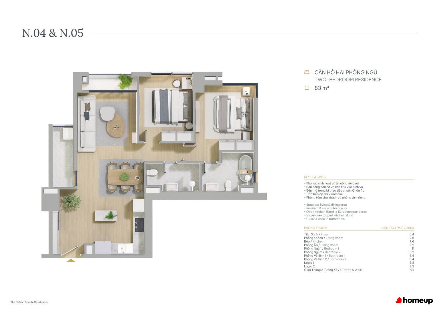 Thiết kế căn hộ sang trọng, đầy đủ tiện nghi, mang lại cảm giác ấm cúng và gần gũi khi ở nhà! Nội thất bàn giao tại The Nelson được chú trọng đến từng chi tiết, từ sàn gỗ cao cấp, hệ thống đèn LED tiết kiệm điện, đến bếp đảo đá Vicostone sang trọng. Phòng tắm được trang bị thiết bị nhập khẩu từ châu Âu, cửa kính lớn tràn ngập ánh sáng tự nhiên và hệ thống điều hòa âm trần hiện đại.