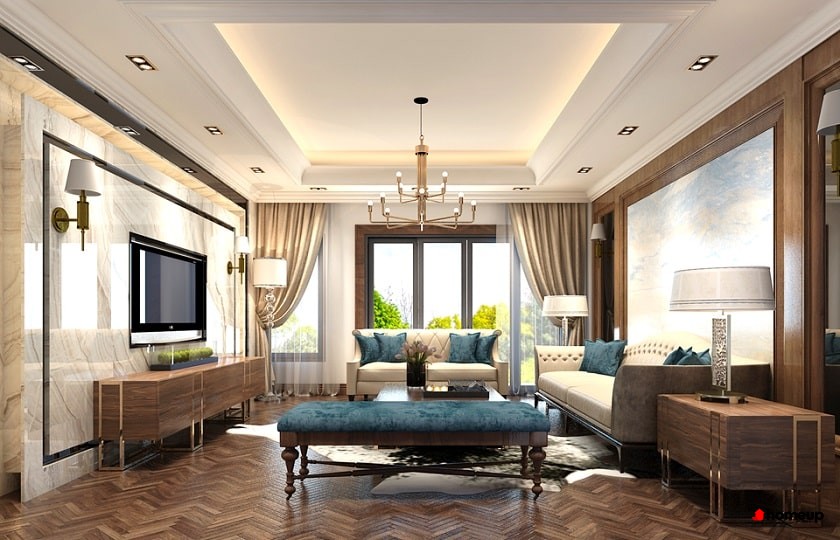 Phòng khách hiện đại tại căn hộ chung cư The Terra Hào Nam Nội thất bàn giao của dự án được lựa chọn kỹ lưỡng với chất lượng cao cấp, gồm sàn gỗ công nghiệp, trần thạch cao, hệ thống đèn LED hiện đại và cửa chống cháy an toàn. Khu bếp được trang bị tủ bếp, mặt đá granite, chậu rửa inox; phòng tắm hoàn thiện với thiết bị vệ sinh thương hiệu uy tín.