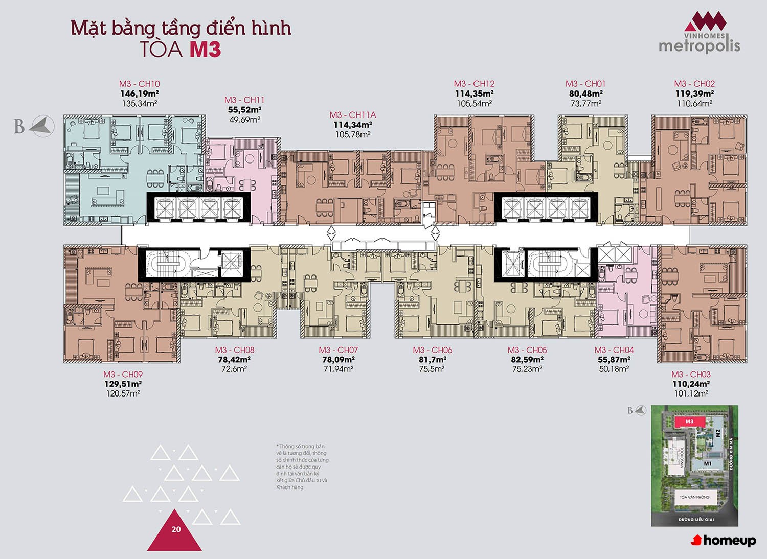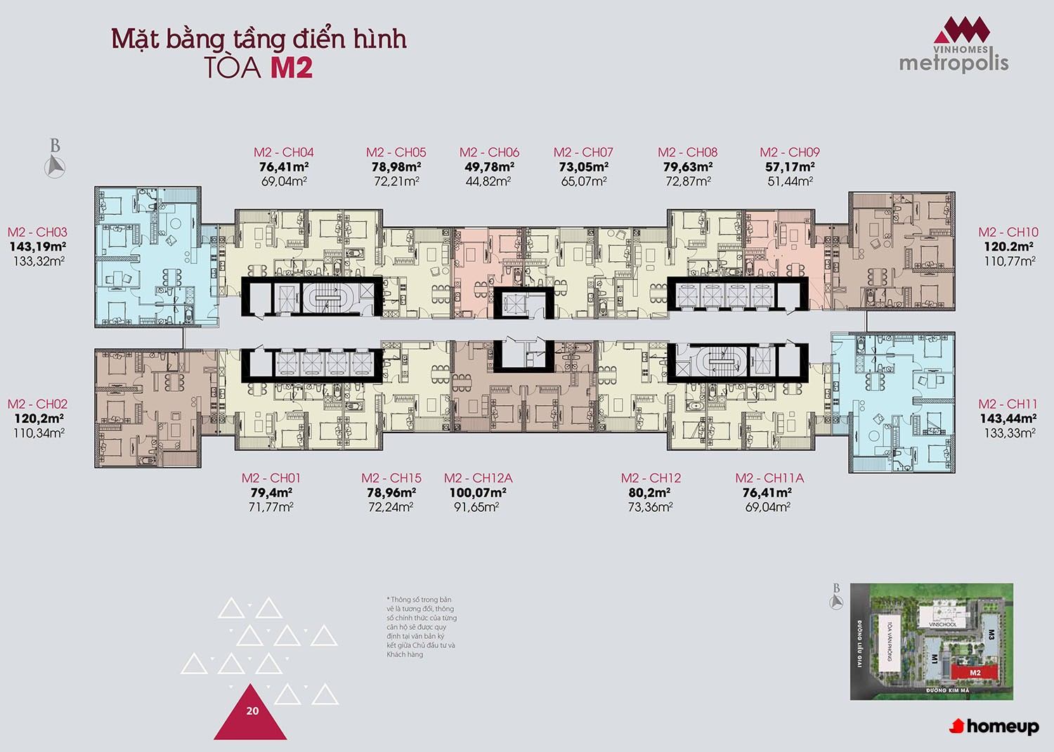 Mặt bằng tổng thể dự án chung cư Vinhomes Metropolis Các căn hộ tại đây đa dạng diện tích, từ căn 1 phòng ngủ cho tới những căn penthouse và sky villa đẳng cấp, đáp ứng nhu cầu của nhiều đối tượng khách hàng. Tất cả được thiết kế thông minh, tối ưu hóa công năng và đảm bảo thông gió, chiếu sáng tự nhiên. Hơn 1.500 căn hộ cao cấp đều có ban công hoặc cửa sổ kính lớn, giúp cư dân tận hưởng trọn vẹn khung cảnh thành phố từ trên cao.