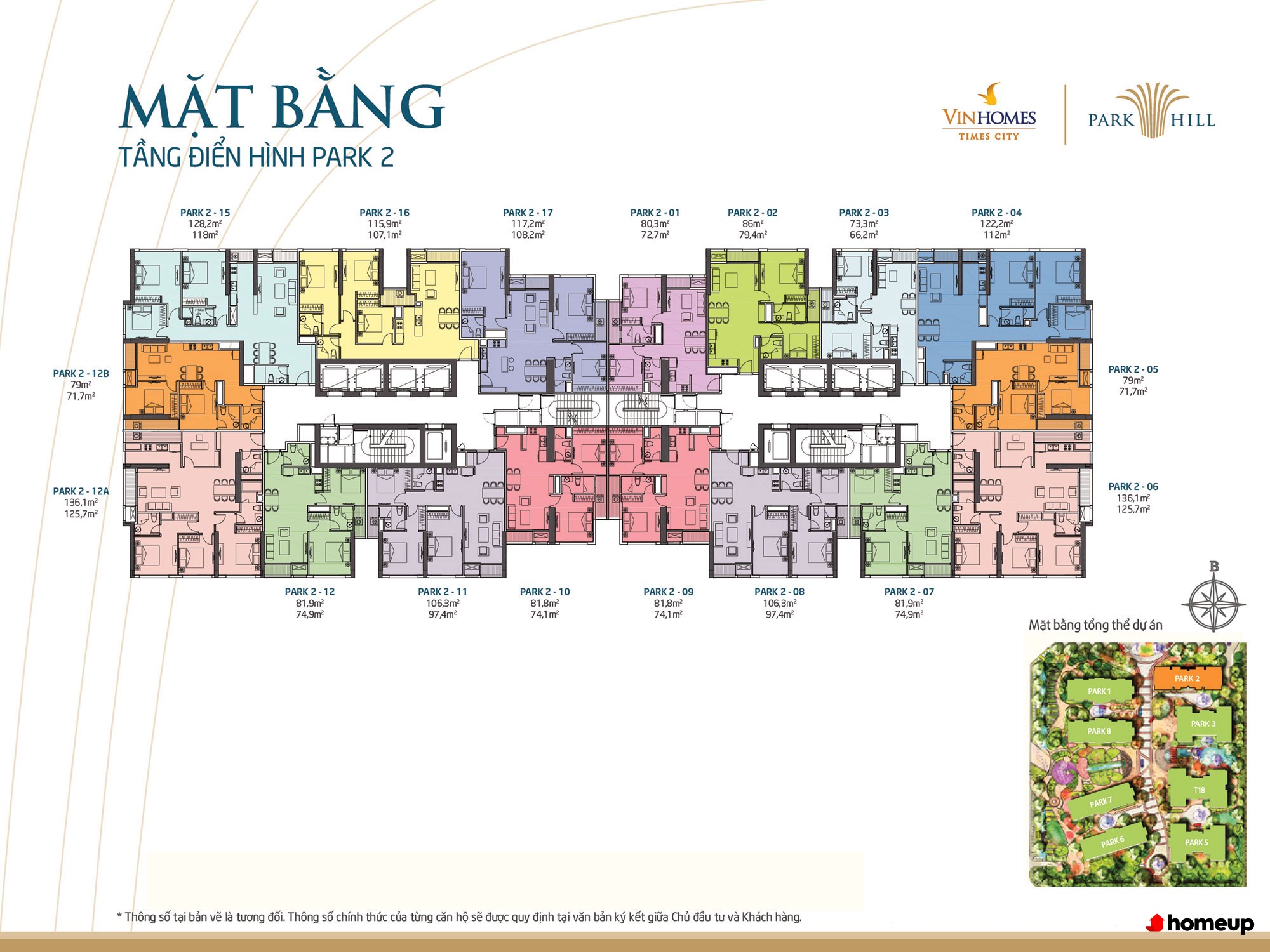 Dự án được chia làm 3 giai đoạn: Times City, Park Hill và Park Hill Premium Các căn hộ tại Vinhomes Times City có diện tích đa dạng từ 47,9 m2 đến 160 m2, thiết kế từ 1 - 4 phòng ngủ, đáp ứng nhu cầu từ gia đình trẻ, hộ gia đình đa thế hệ đến nhà đầu tư. Mỗi căn được bố trí hợp lý, tối ưu ánh sáng và gió tự nhiên, với phòng khách rộng rãi, bếp liên thông, ban công thoáng mát và cửa kính lớn mở ra tầm nhìn bao quát thành phố hoặc cảnh quan nội khu. Không chỉ là nơi ở, mỗi căn hộ còn là không gian thư giãn, kết nối các thành viên và nâng tầm chất lượng sống.